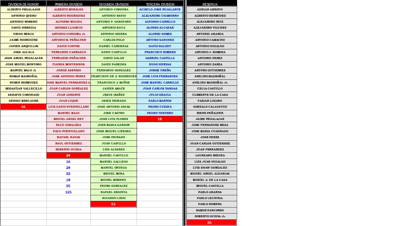 En primer lugar, bienvenidos después del verano. Os adjunto una imagen con los componentes de las distintas ligas para que me confirméis si existe algún error, o decidme por si queréis entrar en tercera división los que estáis en la reserva, o viceversa, pasar a la reserva algunos que estéis en tercera, ya que en breves fechas realizaremos el sorteo de los grupos para la liga de Otoño 2016.